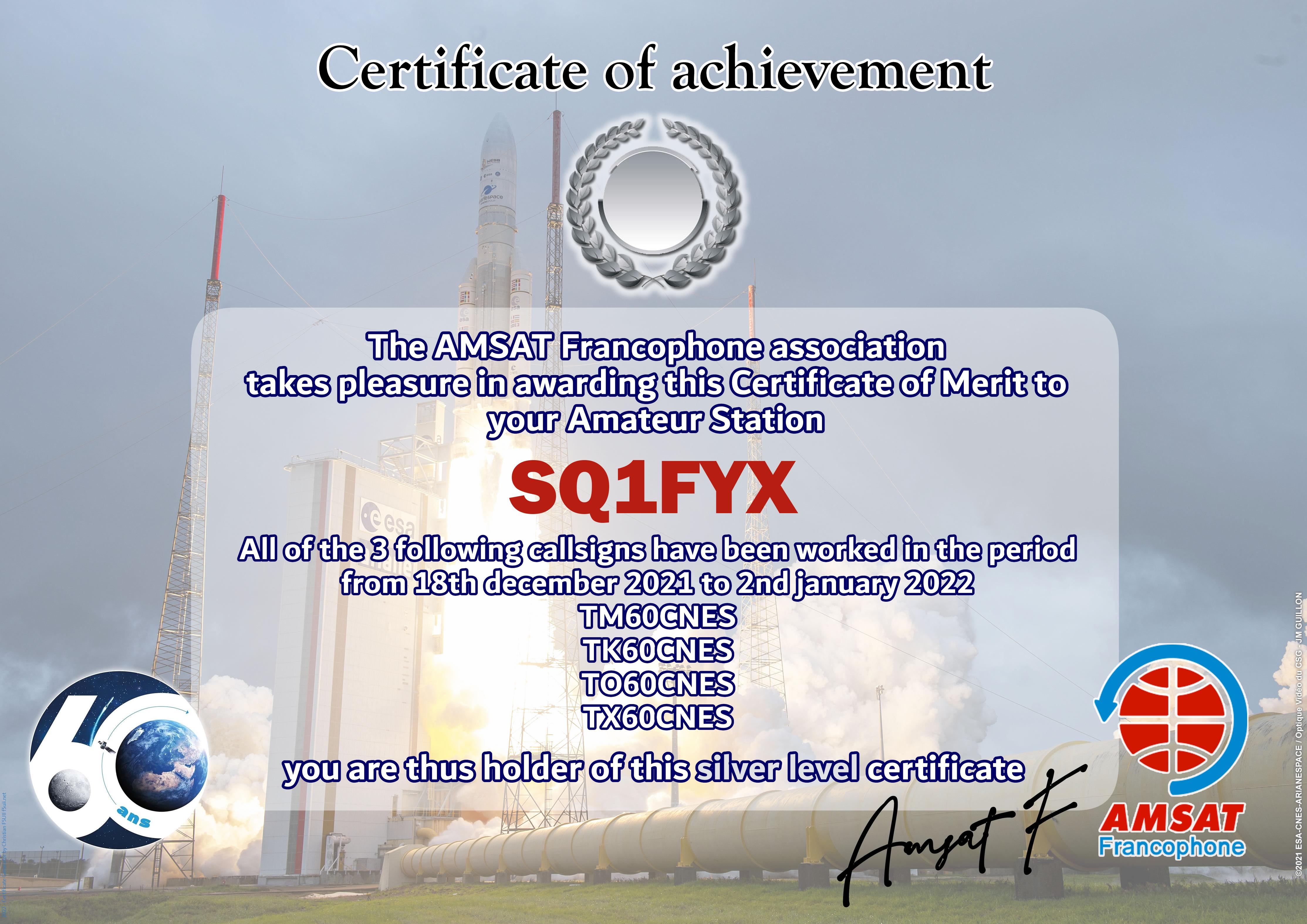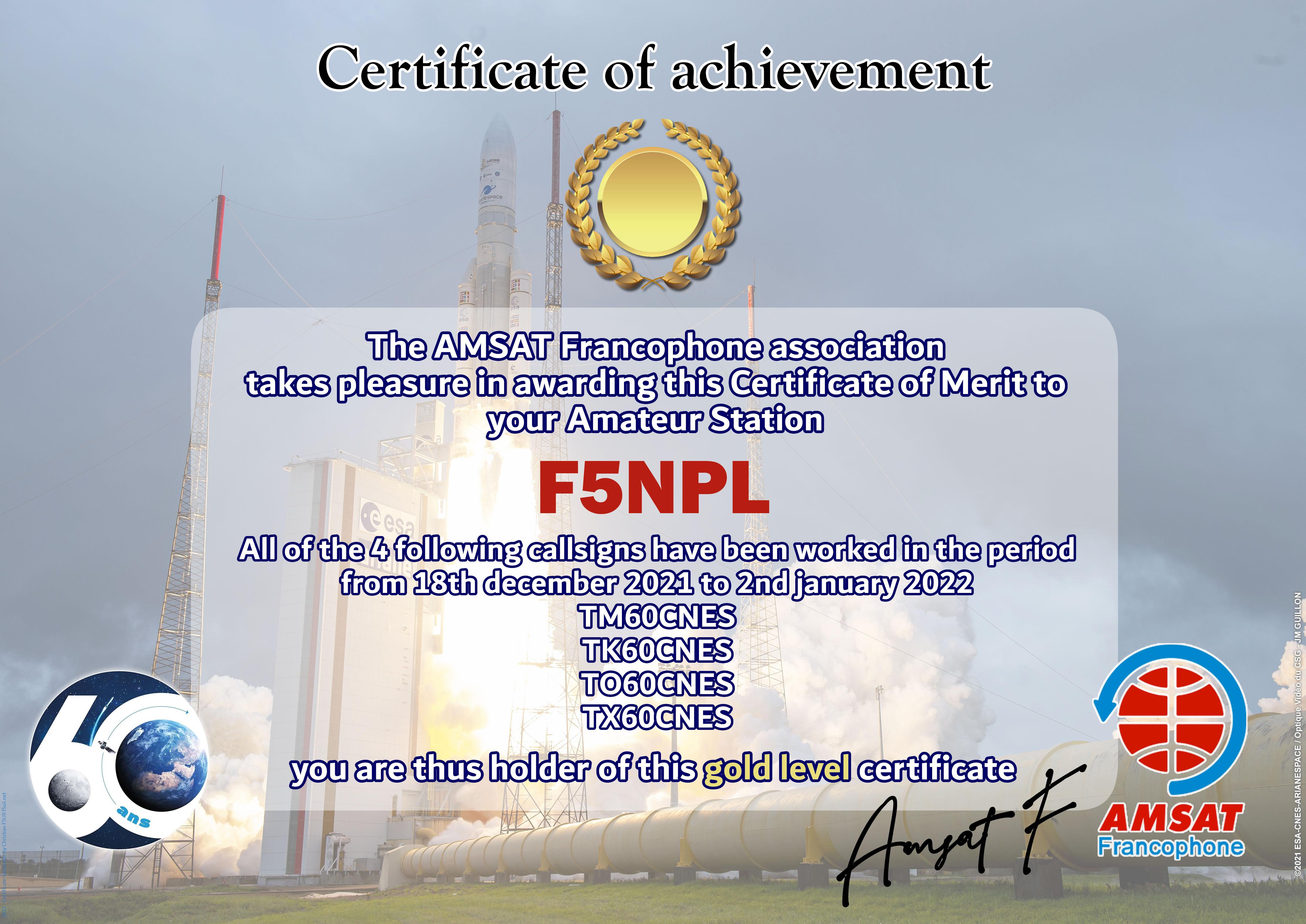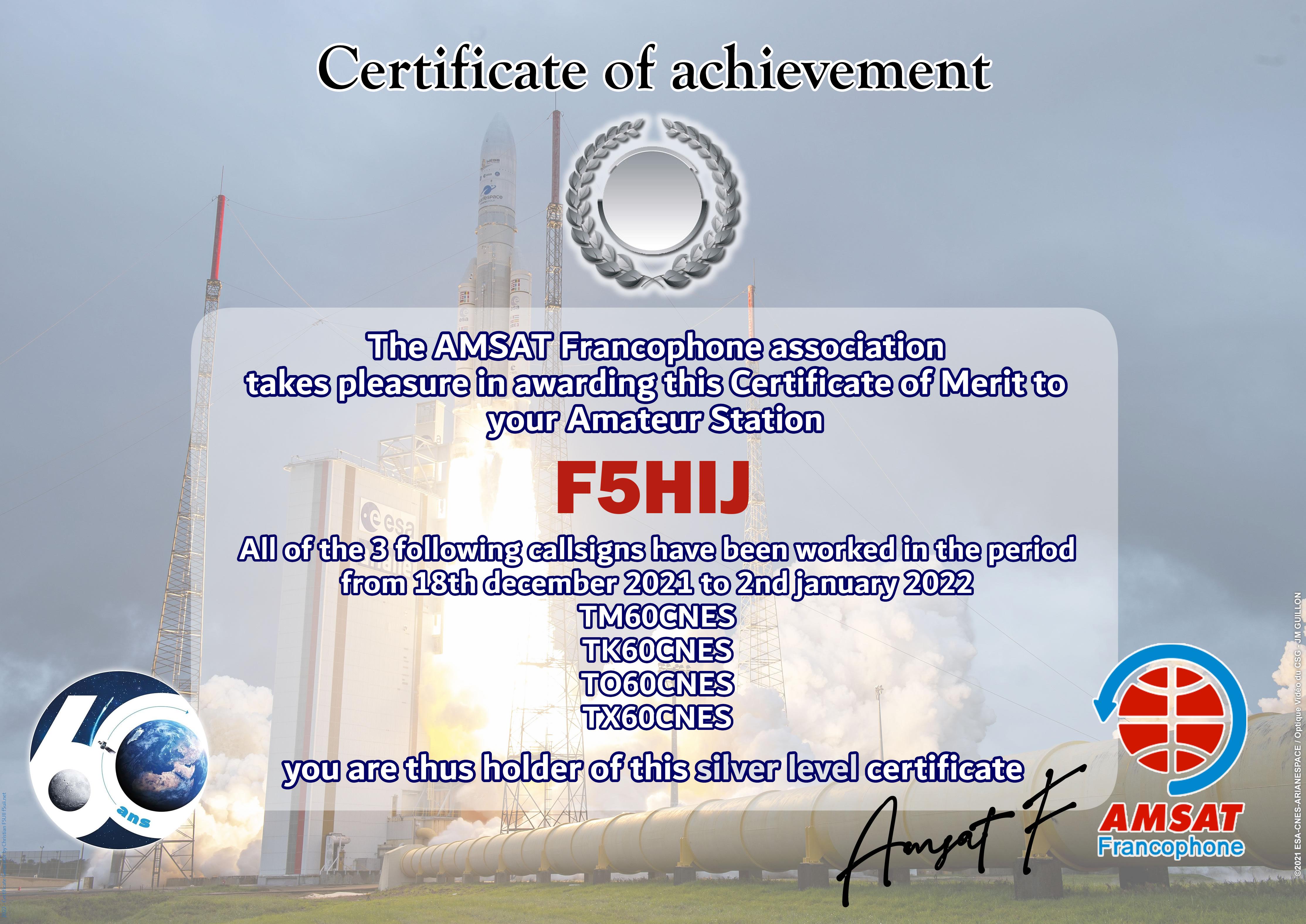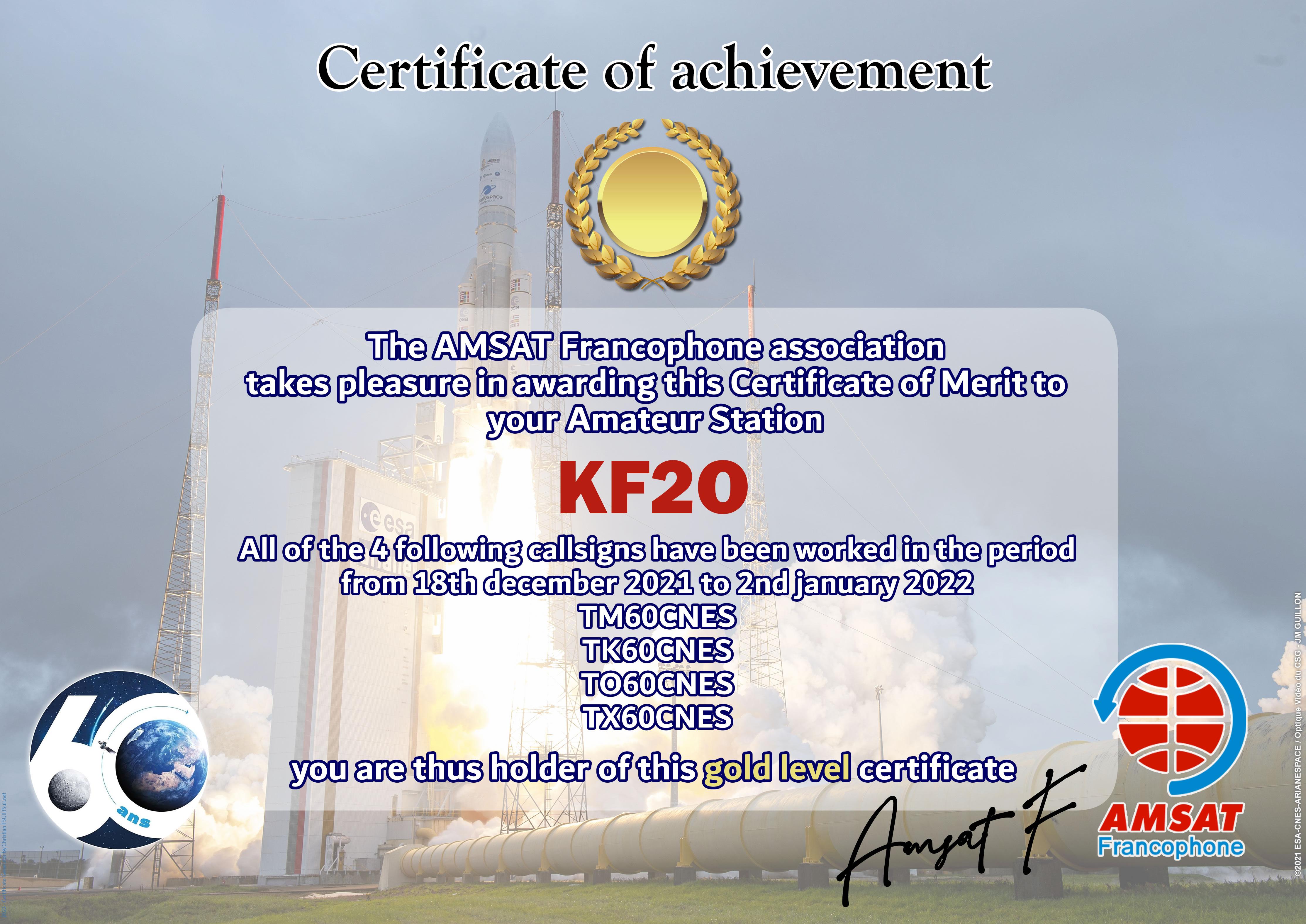 At the end of 2021, CNES celebrates 60 years of existence of the institution. AMSAT-F has reserved the special callsigns TM60CNES, TO60CNES, TX60CNES and TK60CNES. During the period from 18 December 2021 to 2 January 2022, thousands of contacts have been made by radio amateurs from all over the world. The Amsat-Francophone is very pleased to thank you for your participation and therefore proposes to award an Electronic Certificate to the most regular stations. It can be printed by you or easily framed by our partner.