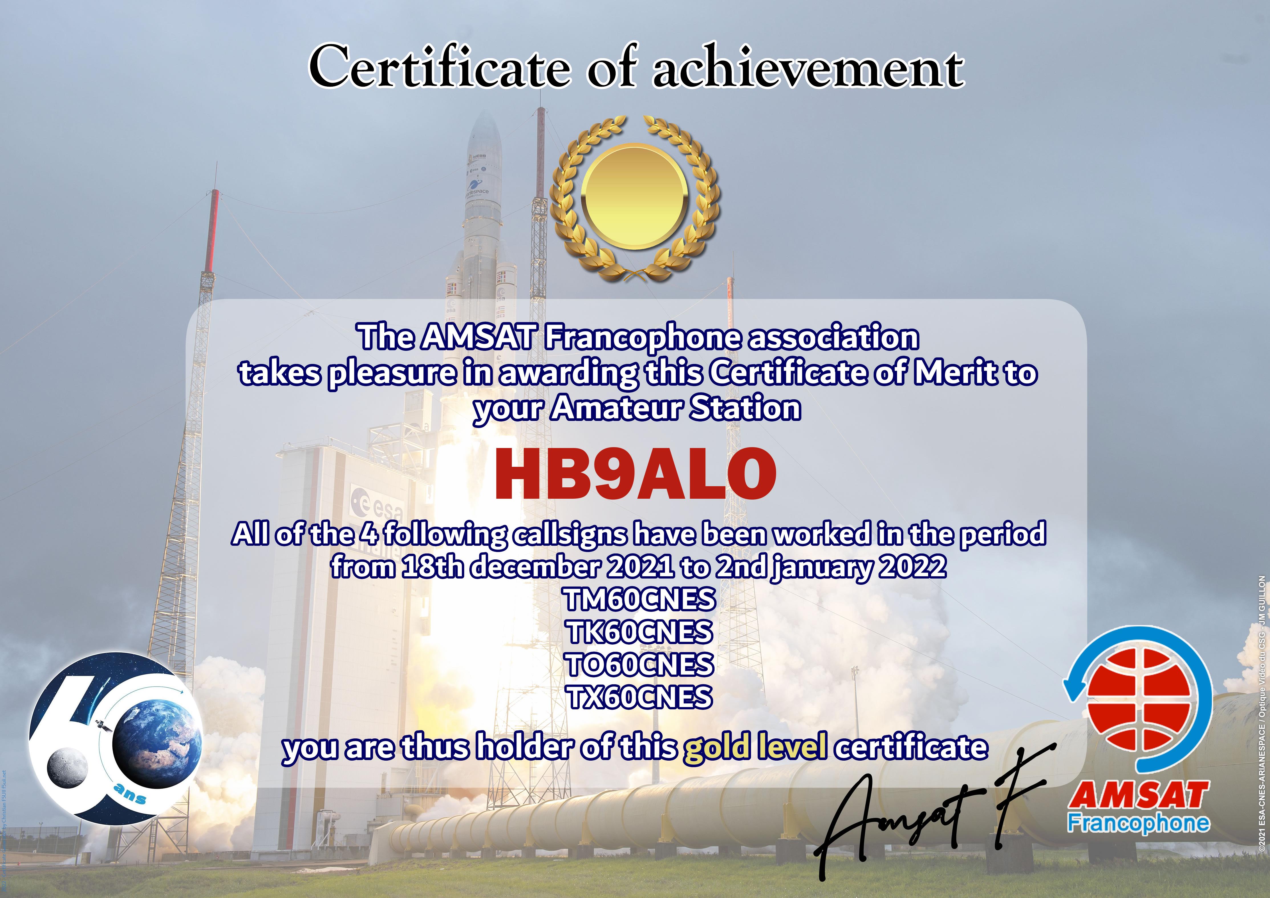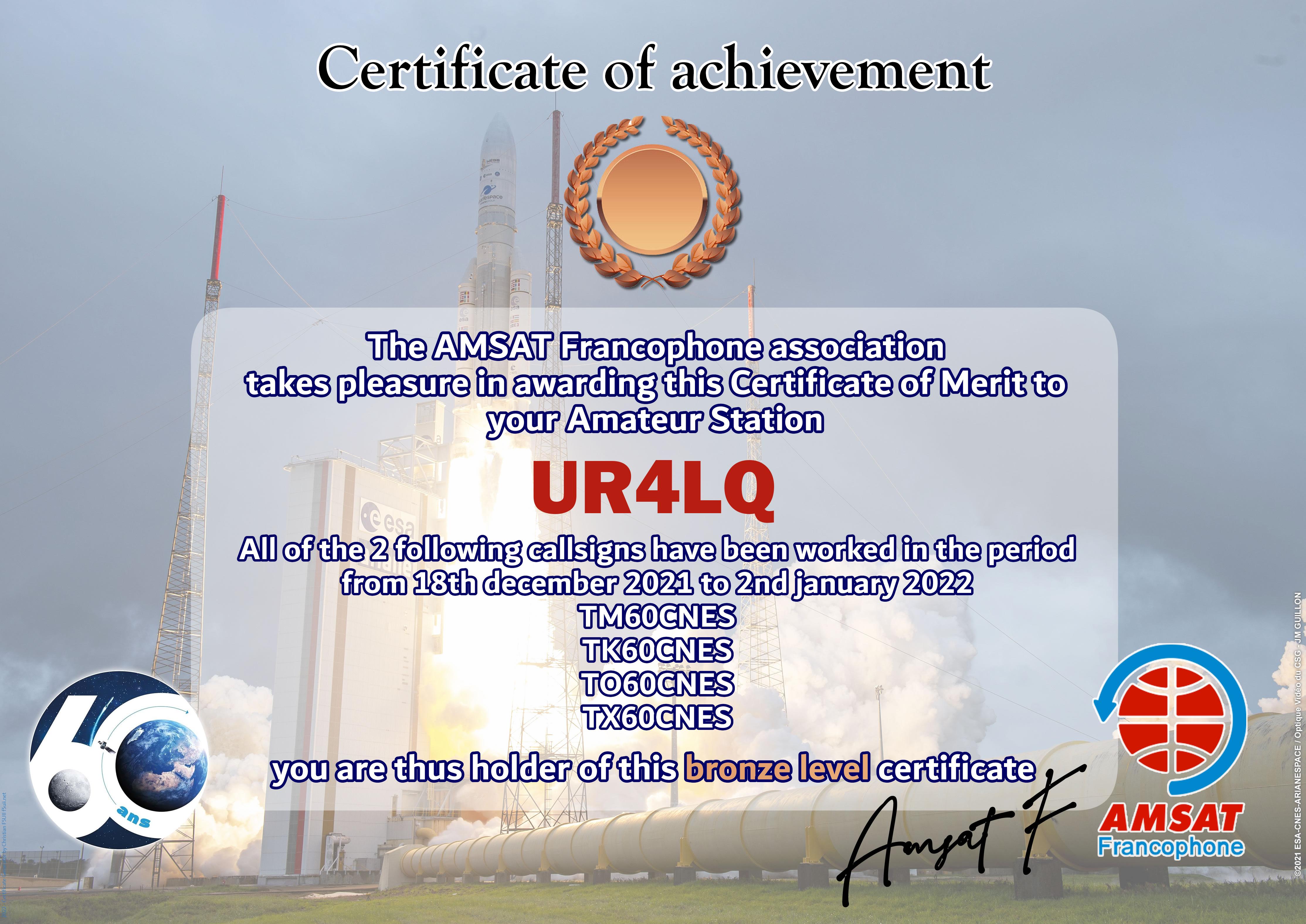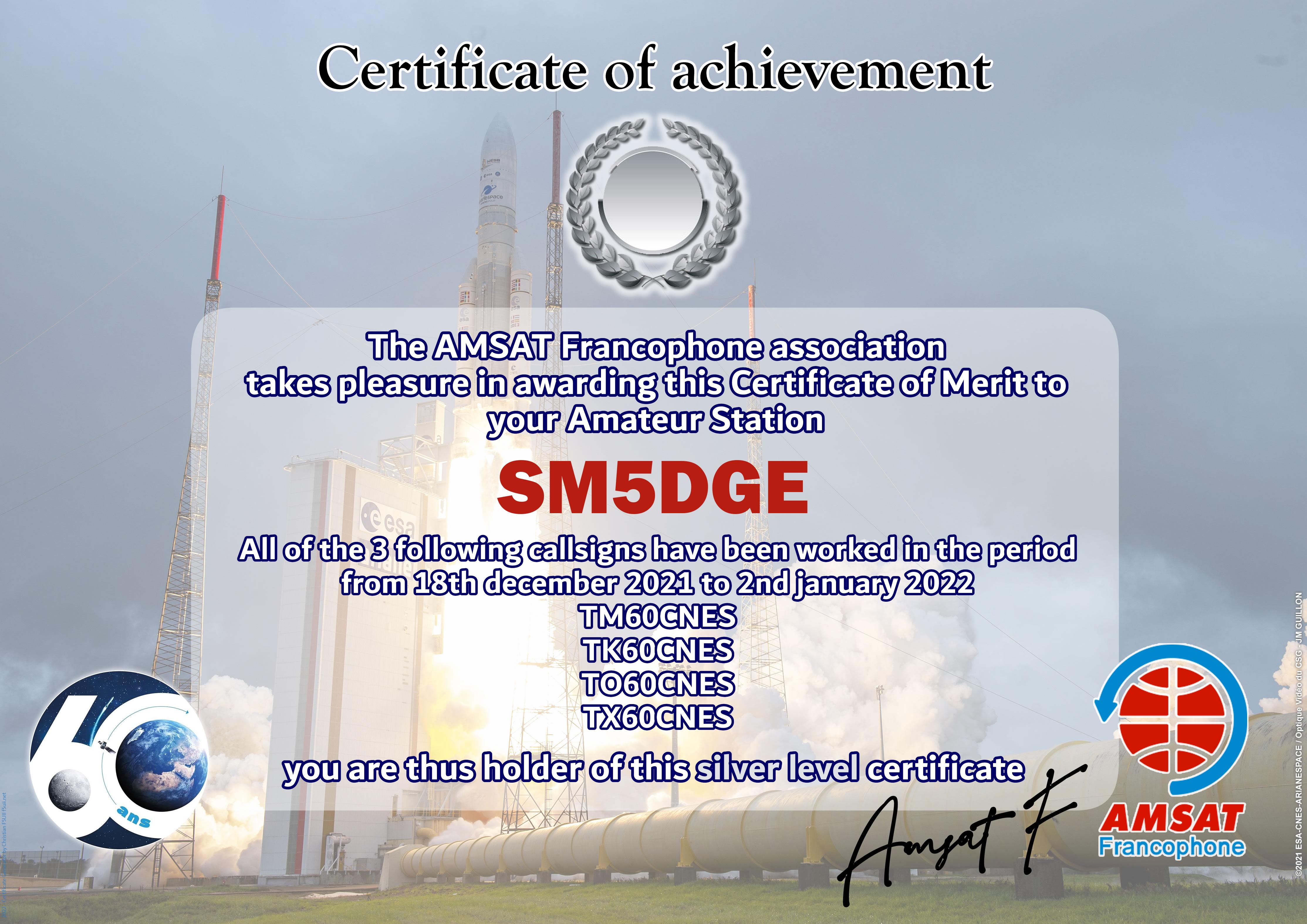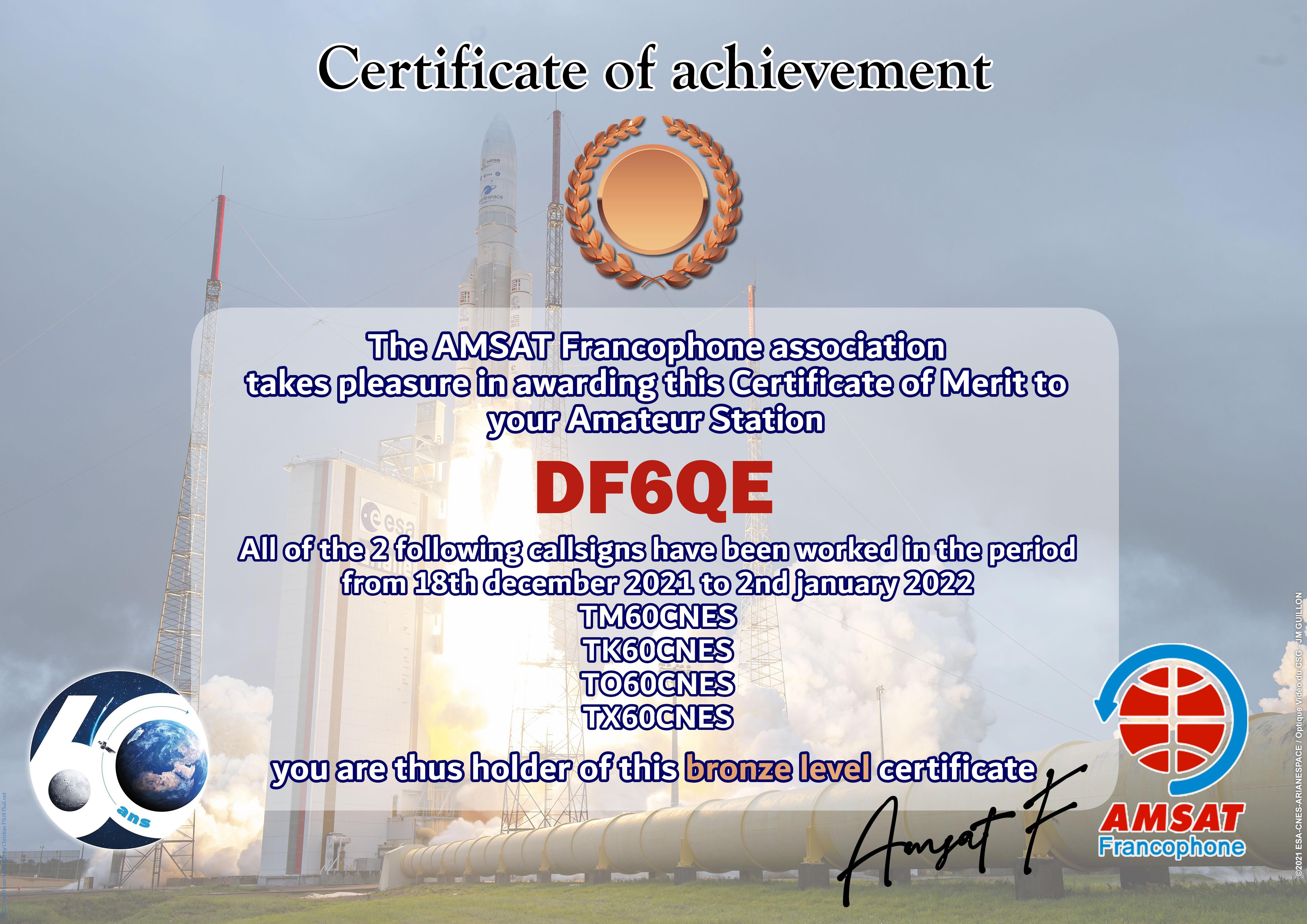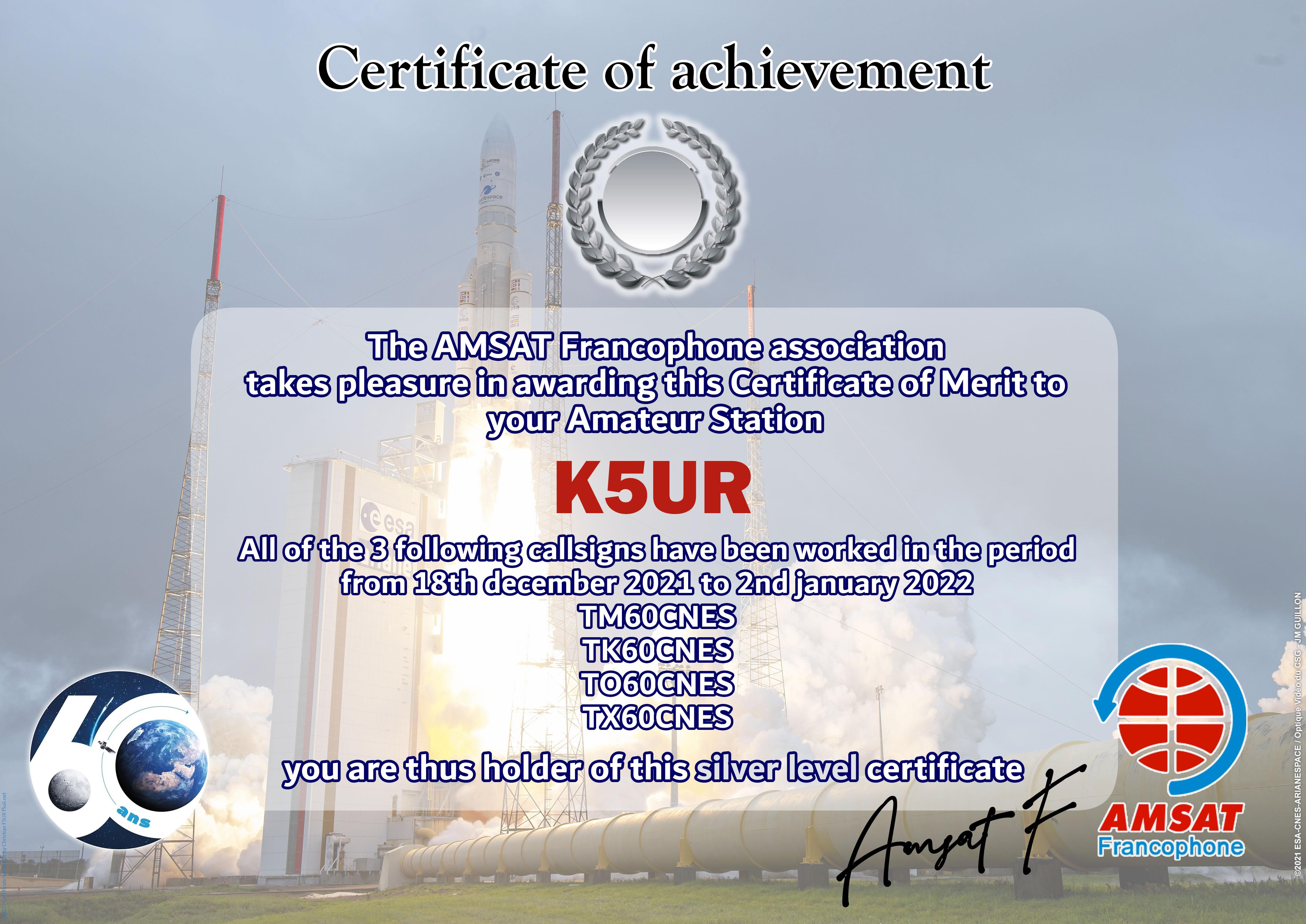 At the end of 2021, CNES celebrates 60 years of existence of the institution. AMSAT-F has reserved the special callsigns TM60CNES, TO60CNES, TX60CNES and TK60CNES. During the period from 18 December 2021 to 2 January 2022, thousands of contacts have been made by radio amateurs from all over the world. The Amsat-Francophone is very pleased to thank you for your participation and therefore proposes to award an Electronic Certificate to the most regular stations. It can be printed by you or easily framed by our partner.