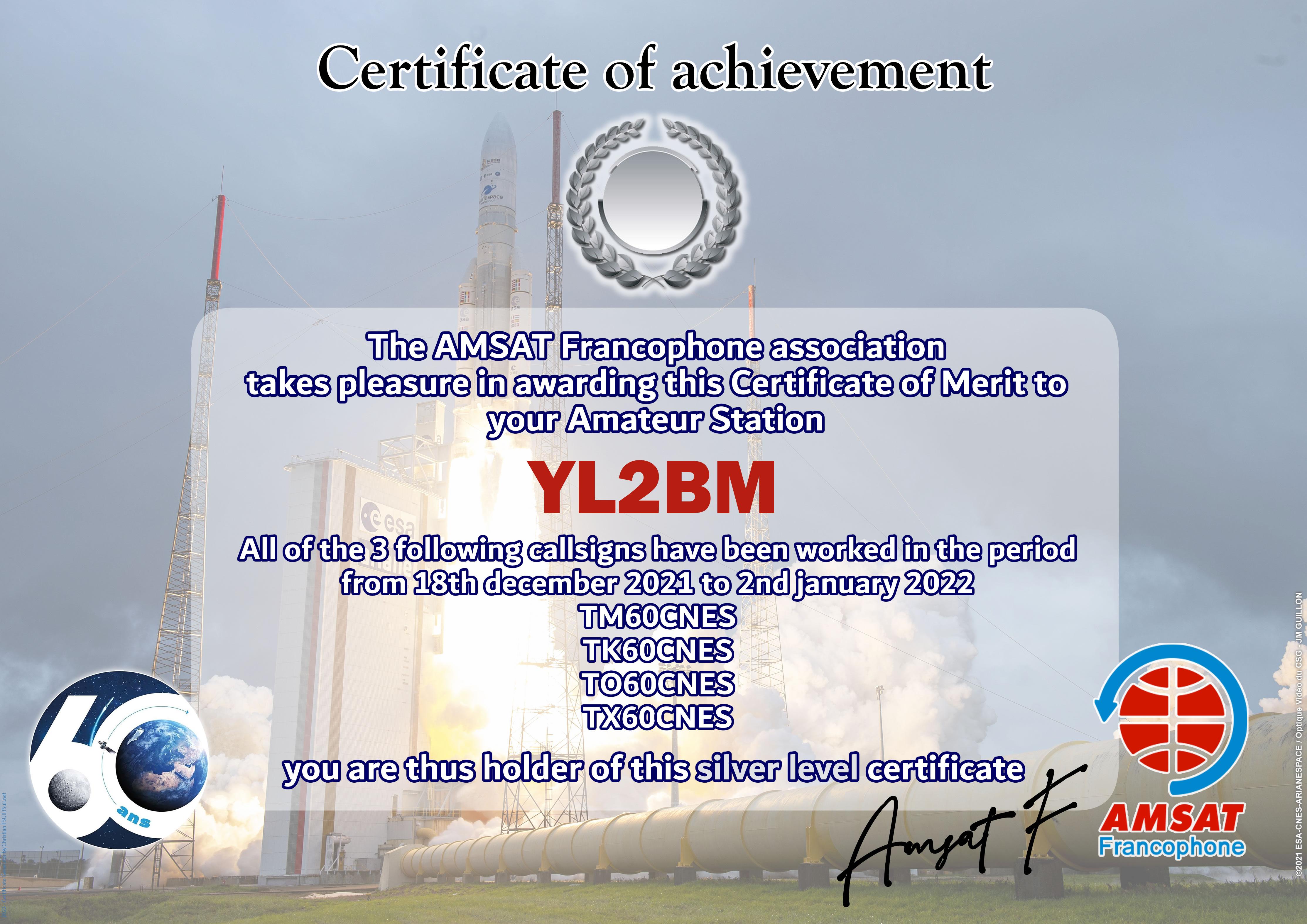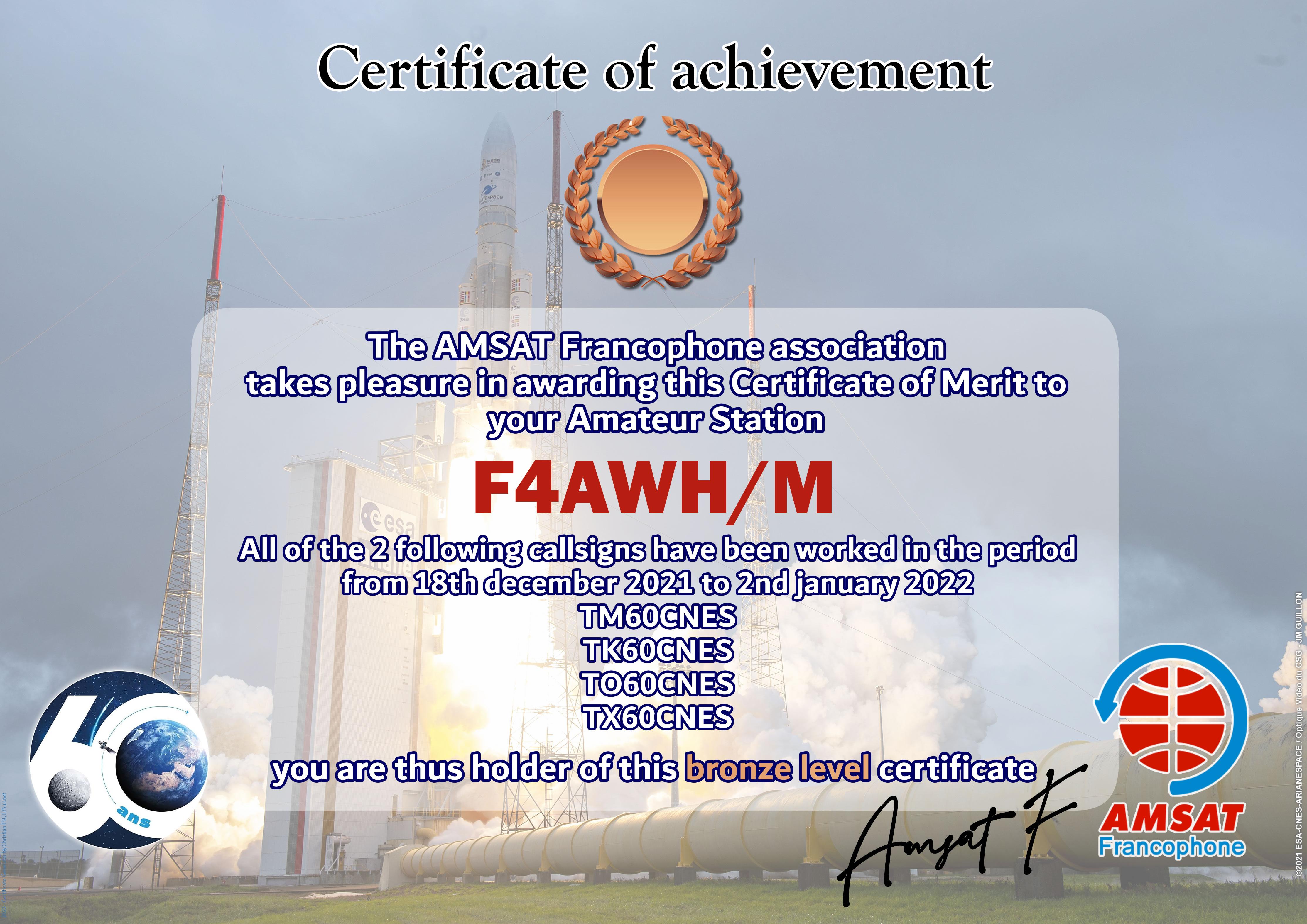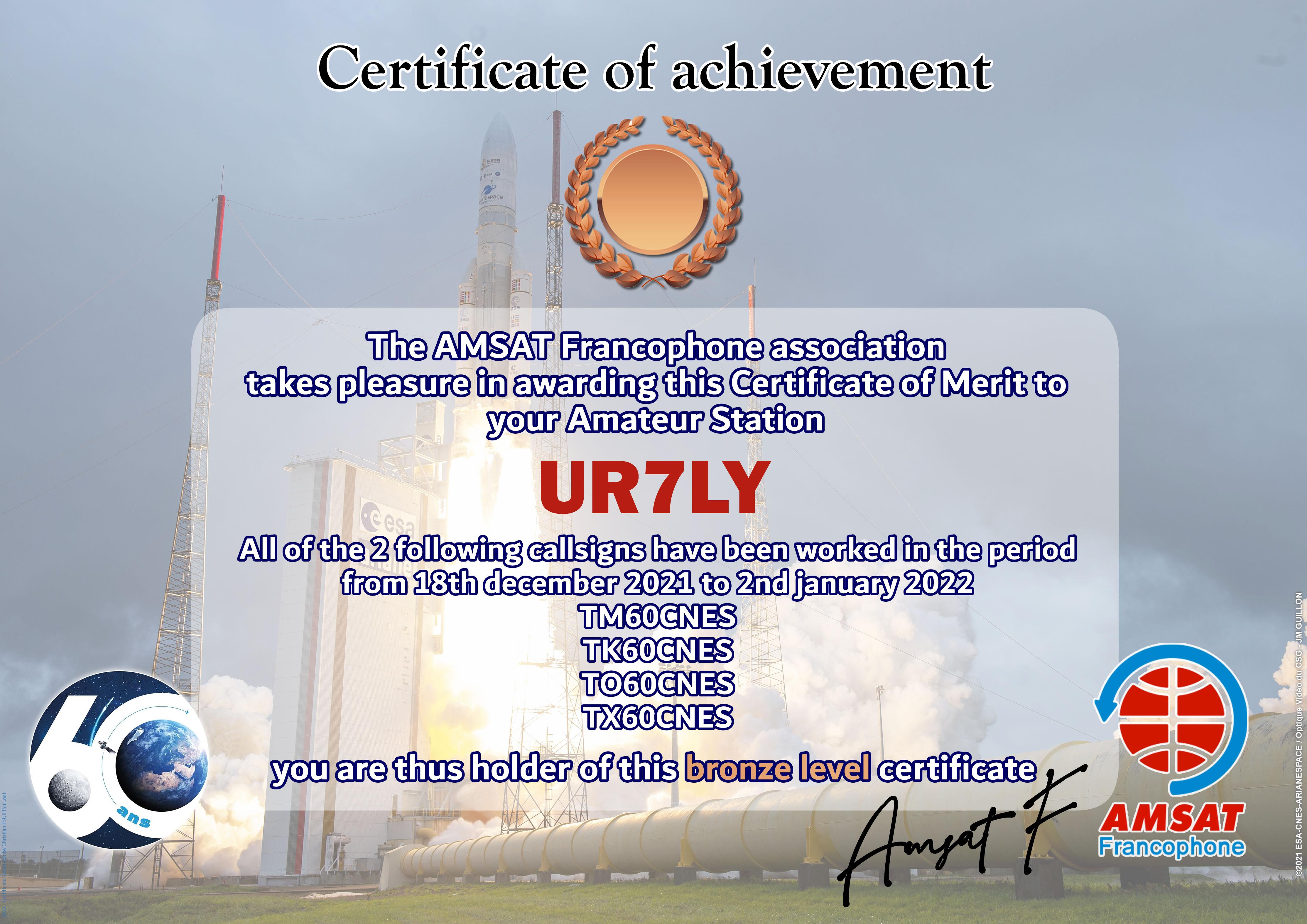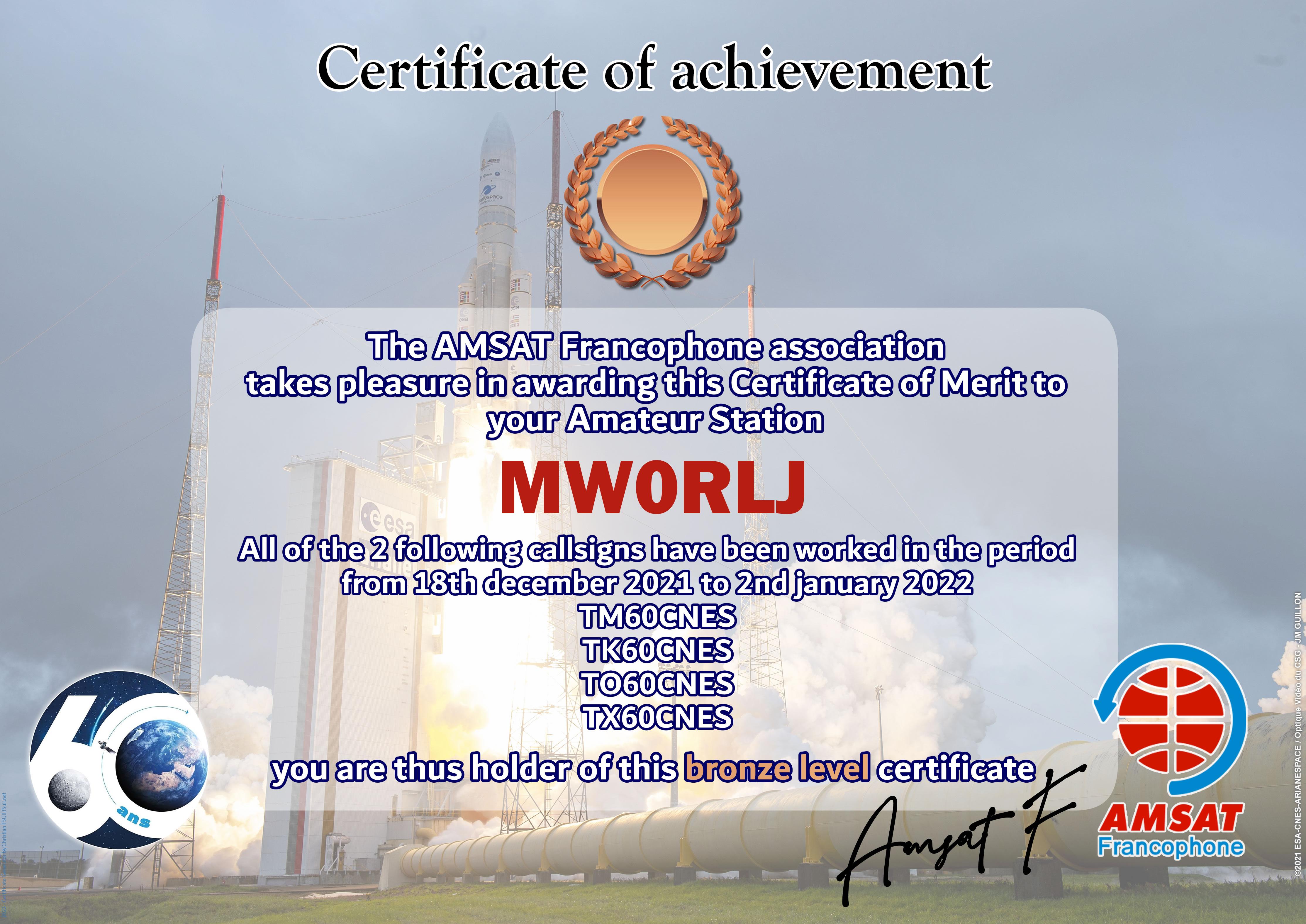 At the end of 2021, CNES celebrates 60 years of existence of the institution. AMSAT-F has reserved the special callsigns TM60CNES, TO60CNES, TX60CNES and TK60CNES. During the period from 18 December 2021 to 2 January 2022, thousands of contacts have been made by radio amateurs from all over the world. The Amsat-Francophone is very pleased to thank you for your participation and therefore proposes to award an Electronic Certificate to the most regular stations. It can be printed by you or easily framed by our partner.
